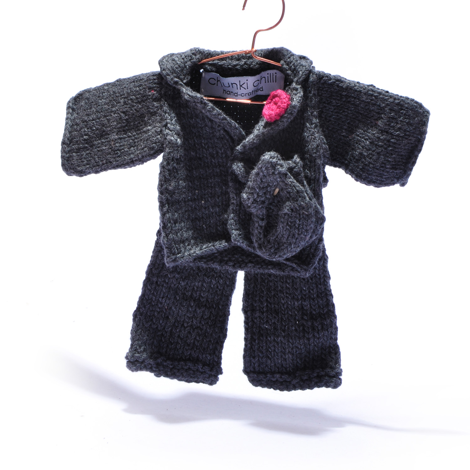 Tags: black suit, changeable, changeable clothes, chunkichilli, hand knitted, organic cotton, red flower, suit
